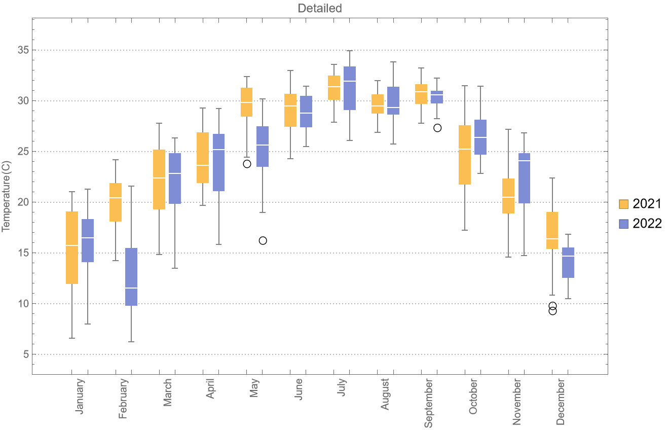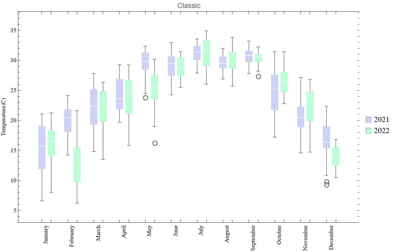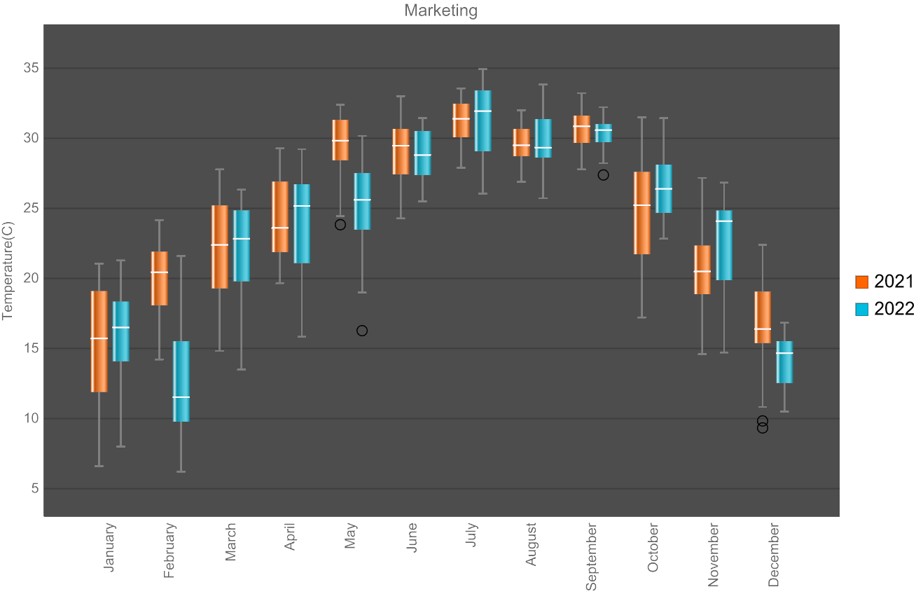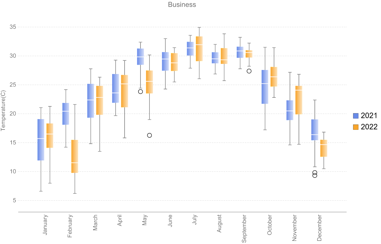 比如绘制广州市2021年和2022年的每天的平均气温,以月为一组的数据,共12组数据的盒须图。