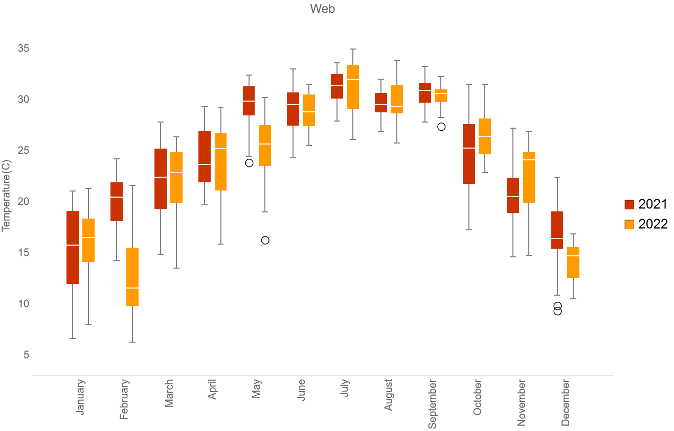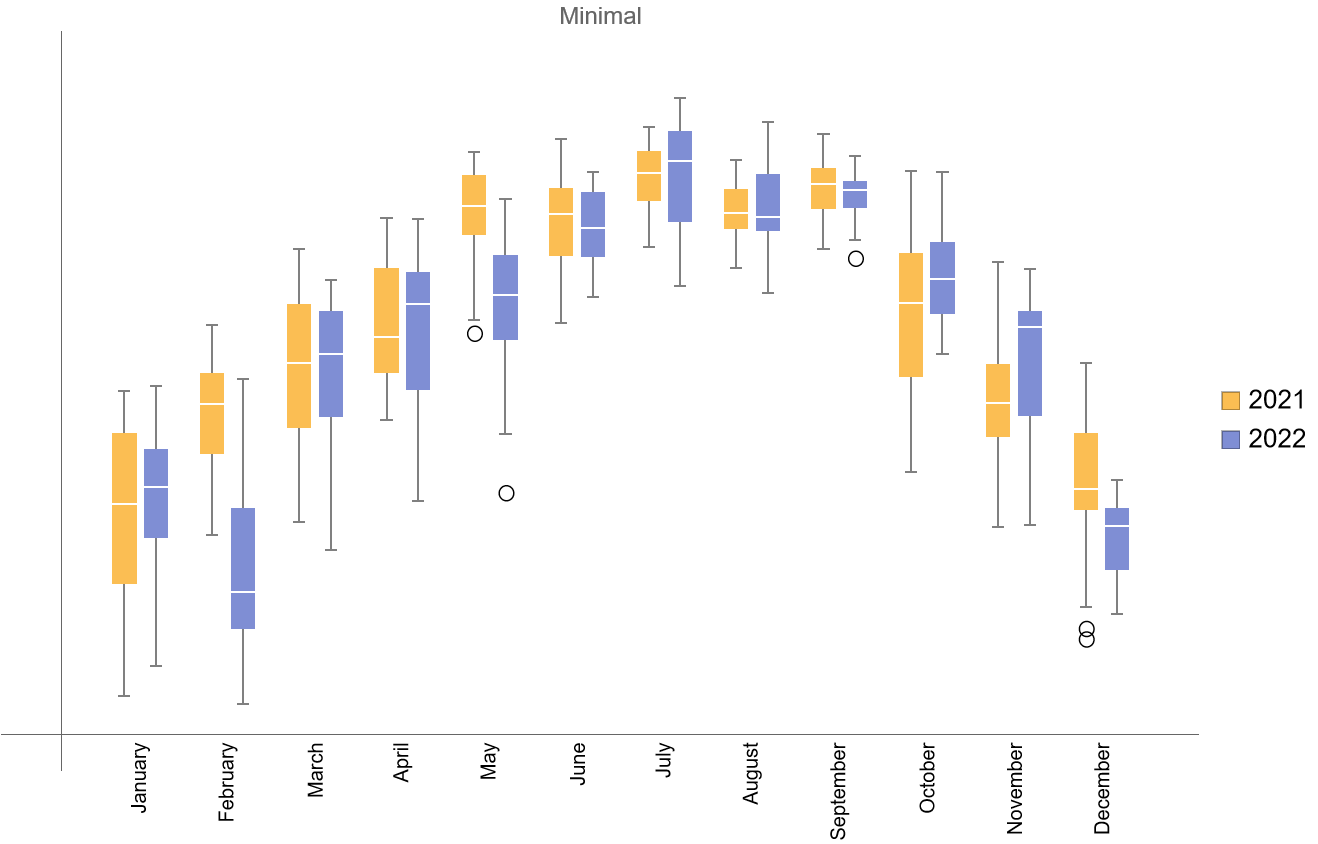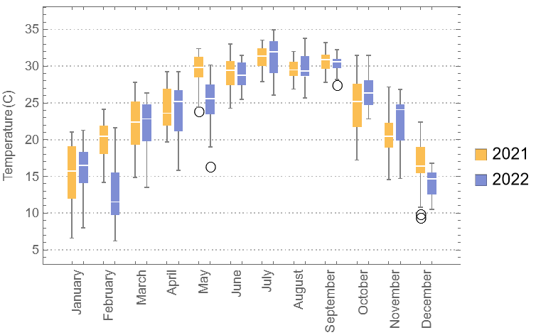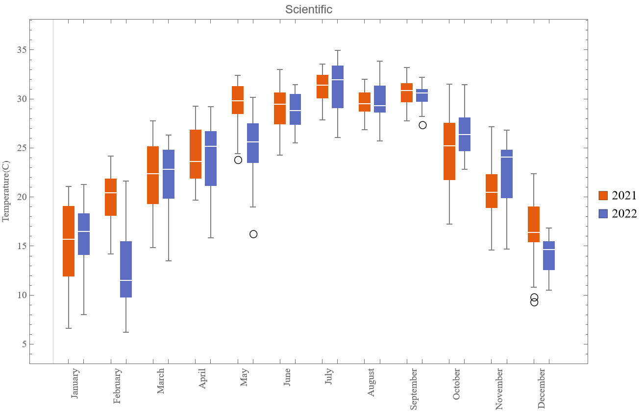 比如绘制广州市2021年和2022年的每天的平均气温,以月为一组的数据,共12组数据的盒须图。