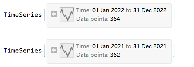 得到了两个时间序列,同时发现两组数据的Data points都不足,即没能获取到全年的数据,于是需要找出缺失了哪一天的数据。