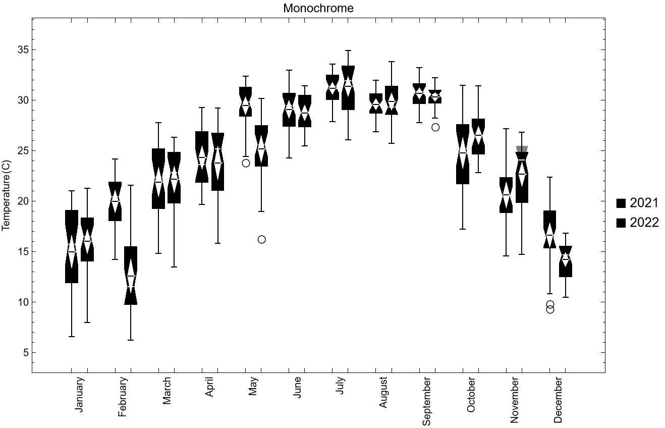 - BarSpacing -> {Small, Large}:指定月份与月份之间的两组盒须图的距离为- Large和指定同一月份下两组盒须图的距离间隔是- Small。